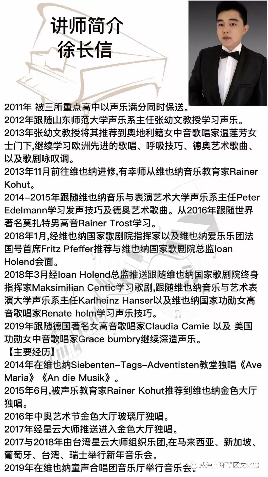 为贯彻落实《公共文化服务保障法》 争创国家公共文化服务体系示范区, 进一步加强基层群众文化建设, 提升群众的文化艺术修养 提供一个学习和交流的平台, 威海市环翠区文化馆邀请维也纳男高音歌唱家徐长信 为广大声乐爱好者举办一场声乐公益培训班。 参加人员