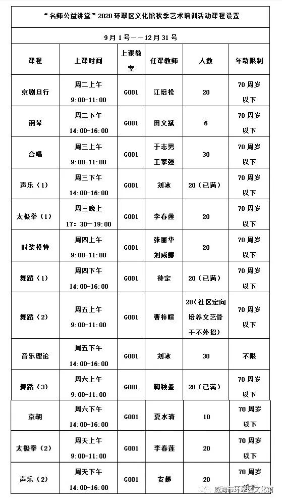 为深入学习贯彻《公共文化服务保障法》、《公共图书馆法》,全力推进国家公共文化服务体系示范区建设,推动全民共享文化建设成果,提升广大群众的文化艺术素养,环翠区文化馆根据群众需求,精心打造公共文化服务品牌“名师公益讲堂”,现开展秋季艺术培训活动,之后将继续打造名师公益讲堂、讲座、展览系列活动。 “名师公益讲堂”2020环翠区文化馆秋季艺术培训课程涵盖声乐、舞蹈、戏曲等多种门类,共计13门课程。本期公益培训实施全年制教学,培训活动自2020年9月起持续到2021年6月。活动开课时间为2020年9月1日至2021年6月27日,教学计划共计32周。 招生相关事宜 活动性质: 公益培训 免费培训 报名条件: 凡工作、生活在威海市,身心健康,热爱艺术,具有良好的组织纪律性,能自觉遵守环翠区文化馆有关规定,能够按时保质完成培训的成年人,具体要求见课程设置一览表。 教学周期: 2020年9月——2020年12月,共16个周。 上课时间: 上午9:00——11:00 下午14:00——16:00 晚上17:30——19:00 培训地点: 青岛北路威海文化艺术中心附1层(一楼和二楼的夹层)G001室 报名时间及方式 报名时间: 活动即日起开始线上报名,不接受现场报名。为保证良好的教学秩序,各门课程以报名顺序为准,额满即止,特殊群体(残疾人、外来务工人员、生活困难人员)优先报名,微信留言备注。 报名方式: 1、关注“威海市环翠区文化馆”微信公众号,在对话框发送“姓名+电话+报名班级”。报名成功后,按规定时间来馆上课,无需现场确认,以收到“报名成功”反馈为准。 2、每个微信号仅限一人报名,每人最多报1个班级(音乐理论可兼报)。 报名咨询电话:0631-5288336 扫码关注威海市环翠区文化馆 课程设置 注意事项 1、我馆开馆时间为9:00—19:00,每周一闭馆。早上8:40市民可陆续排队进馆,进馆需佩戴口罩,出示绿码,测量体温,市民车辆可停地下停车场。 2、我馆严格落实疫情防控常态化工作,要求报名学员无重大疾病,体温正常;如隐瞒病史,在培训期间发生相关的意外情况,由本人承担全部责任;如因隐瞒疫情史造成人员感染的将根据相关法律条例追究法律责任。 3、之前已经报名声乐班、舞蹈班的学员,即为报名成功,本次请勿重复报名(音乐理论除外)。 4、报名成功者首次上课请携带身份证进行身份确认,首次上课缺席将视为自动放弃,我馆不再保留学习资格。不换班、不替补、不旁听。上课学员冒名顶替、课前点名超三次无故旷课将取消学习资格,后续活动将不具备报名资格,空缺名额将视情况进行补录。 5、市民需根据自身身体状况和课程有关要求,慎重选择适合的课程,开课后学员需全程参与学习,学员有义务参与我馆组织的相应公益演出、汇报与观摩交流活动。 6、学员在学习期间因教学需要产生的服装费、教材费等费用由学员自行承担。 7、到馆学习的学员要爱护馆内公共设施和教学设备,注意人身安全,须签订安全责任书。 8、本次活动所产生的相关问题最终解释权归威海市环翠区文化馆所有。 部分授课教师简介 女,1956.8。国家一级演员,中国戏剧家协会会员、威海市第八、九、十届政协委员,两次荣获市、区十佳文化工作者称号、1988年调入威海市群艺术馆——退休。1971年参加威海市京剧团工作,主功刀马,花旦、主演过《红娘》、《白蛇传》、《卖水》等几十出大戏,折子戏,多次在省艺术节专业演员比赛中荣获一、二等奖。 女,1957.4,原威海市群众艺术馆副馆长,副研究馆员,山东省电影家协会会员,威海市电影家协会理事。获山东省小品大赛编导、演出一等奖。全国第五届中老年模特大赛编导奖、团队奖。2015年5月16号策划并组织参加全球吉尼斯旗袍模特秀。2017年策划组织全球华人艺术盛典并编导的“蓝蓝的海”“中国茶”分别获金钻奖和金冠奖。授予“全球华人艺术盛典宣传大使”称号。2019年获高级艺术模特培训师、评审师、编导师。 青年男高音歌唱家,就职于中国音乐家协会爱乐男声合唱团(原中国武警文工团青年男高音),北京音乐家协会会员,北京音乐家协会指挥专业委员会会员,代表作品:俄罗斯民歌《卡林卡》、《黑皮肤的姑娘》、与国家一级演员黄华丽合作《十五的月亮》等,师从著名旅美男低音歌唱家崔宗顺,并多次由著名歌唱家李双江、戴玉强、阎维文老师等指导学习。 国家二级武术裁判员,国家级社会体育指导员,国家一级气功社会体育指导员,国家一级武术教练员。2017年第六届国际武当演武大会太极拳、太极器械个人获得5枚金牌。荣获第十四届中国烟台国际武术节太极拳、太极器械3枚金牌。多年来致力于推广发扬传统武术,努力传承吴式太极拳。被评为“省级先进体育工作者”,“优秀武术传承人”“优秀武术教练员”和武林精英等称号。2014年拜入关振军老师,杨振宇老师门下,系吴式太极拳第六代传人,印诚功法第三代门人,东岳太极第三代传人。 中共党员,山东省音乐家协会会员、威海市音协声乐专业委员会秘书长。2009—2011年,孙家疃街道宣传干事、文化站长;2011年至今,环翠区文化馆;2017—2018年,中共环翠区委组织部党性教育基地。从事群众文化活动十年来,共组织、参与各类文化活动、群众文化培训几百场次,获得“山东省优秀农村文艺人才”等省级荣誉4个、市级荣誉6个、区级荣誉4个,并创作、发表多篇群众文化类论文。