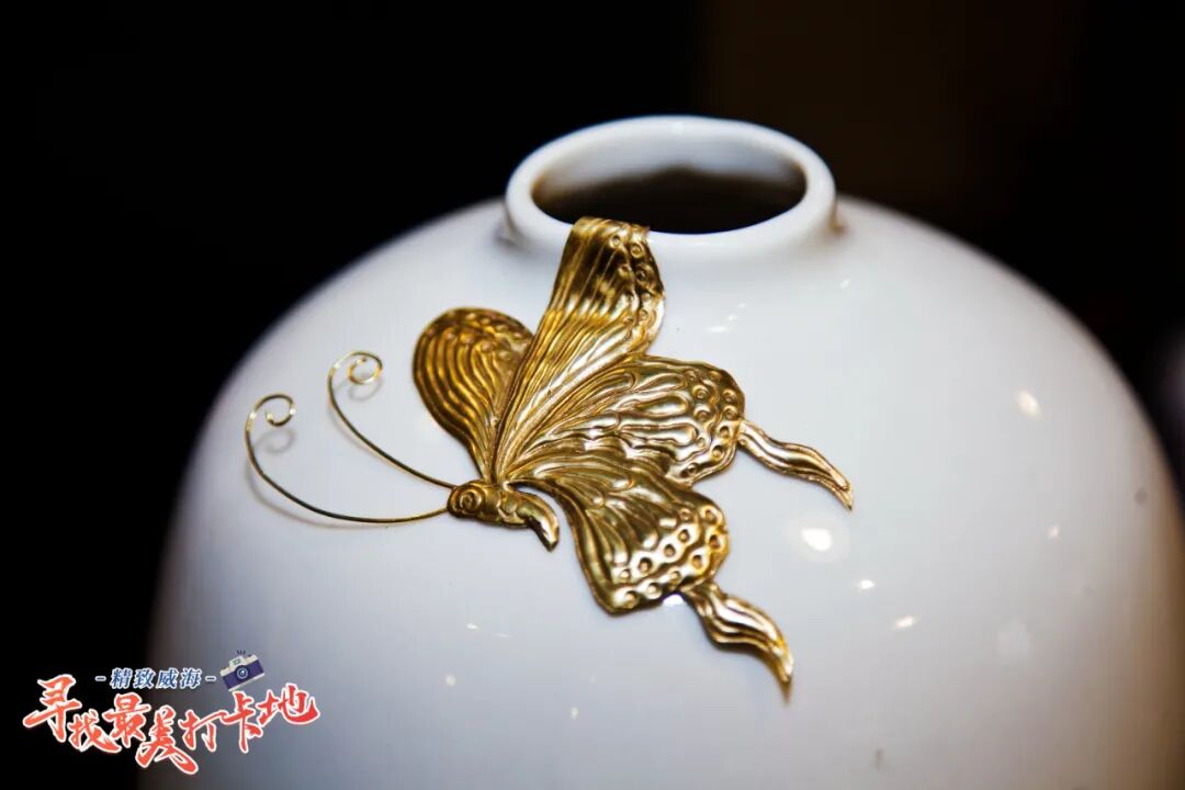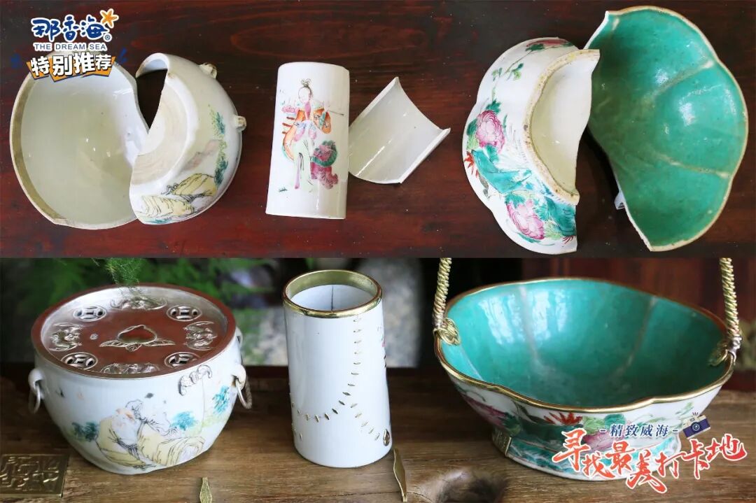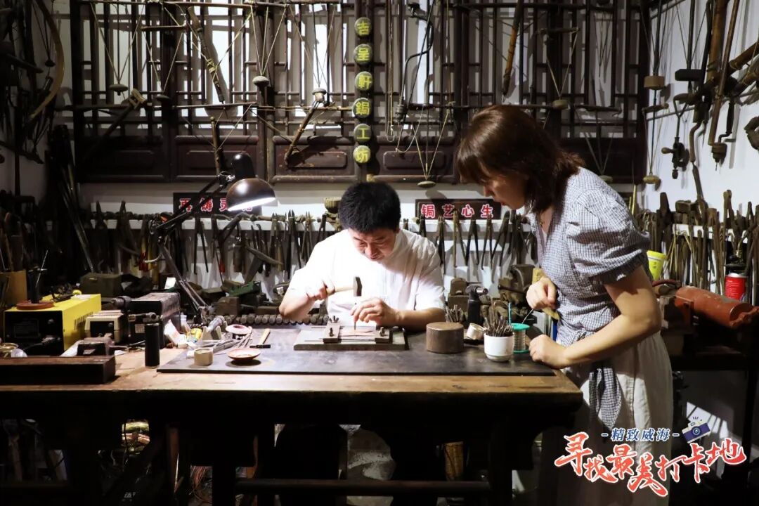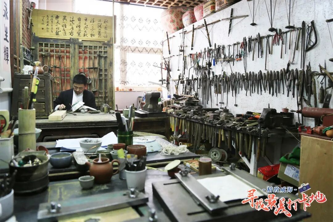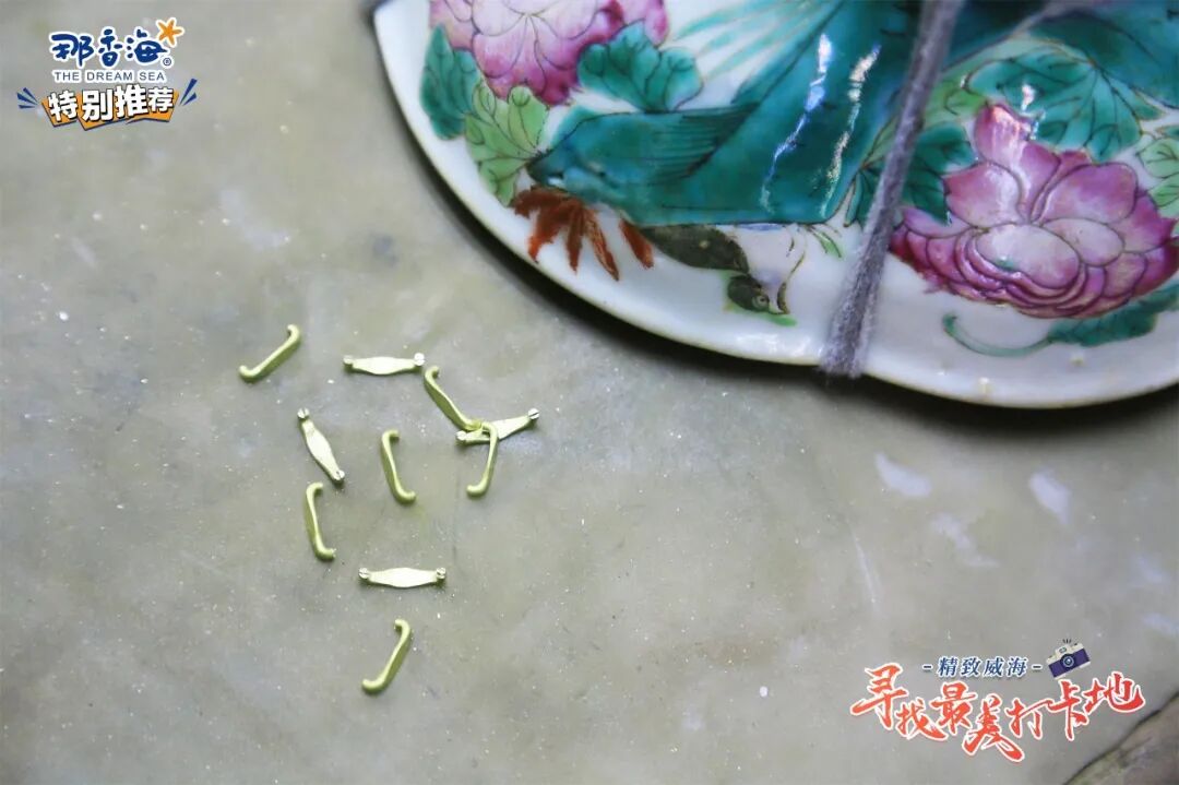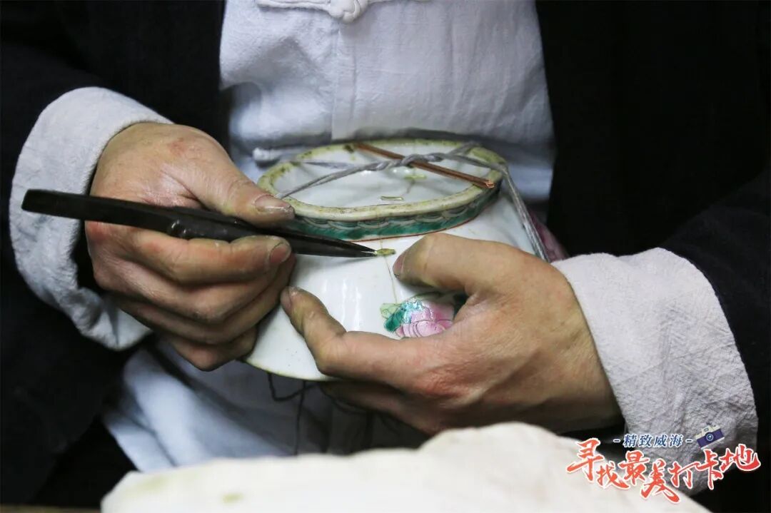 新威附路,威海最有韵味的一条老街,纵使时光流逝,但芳华依旧。在这条老街最北端的陶瓷厂院内,藏着一间锔瓷匠人的工坊,闹中取静,敞开门是繁华的街区,关上门可以进来享受一段悠闲的时光。走进吉呈轩锔工坊,随处可以看到充满威海味儿的老物件,还有古朴的木质桌椅、精美的锔瓷陈列品、挂满墙的锔补工具……都让人仿佛回到那个巷子里充斥着“锔盆,锔碗,锔大缸”吆喝声的年代。吉呈轩的主人名叫耿海胜,他是山东省非物质文化遗产传统锔艺项目的代表性传承人。此时的耿海胜正在修补一只破损的瓷盘,瓷盘裂成了两半,耿海胜仔细观察碎片的碴口后,小心地将破裂的碎片摆正,拼接起来,用绳子反复扎紧。中国有句古话叫“没有金刚钻,别揽瓷器活”,说的就是锔瓷这门手艺,锔补修复瓷器,最大的“利器”,就是独一无二的“金刚钻”和“锔钉”。耿海胜来回拉动钻杆,带动钻头旋转,动作娴熟,对力道的把握胸有成竹。选好锔钉,揳进钻孔,朝锔钉敲上一锤,一排敲下去,锔钉已经跟碗“咬”在一起,难分彼此。锔瓷全过程包括找碴、捧瓷、打孔、制钉、上钉和弥缝。看起来不难,但每个步骤都是细心活。对上碎片,细绳绑定,上弓打眼,截铜造锔,扬锤敲锔……每一步操作都考验着锔匠手头功夫的准确性和熟练度。播放“锔得漂亮才叫出活,其实最能体现锔匠水平的是设计各种造型的锔钉,让它与原有器物完美融合,兼具艺术性和实用性。”耿海胜说,正如这个釉色漂亮的名家书法瓷瓶,瓶口有残缺,耿海胜按照瓷瓶上的兰花图案和诗句的意境,设计了一个蝴蝶造型的锔钉,锔好后的金色蝴蝶好似停在瓷器上小憩,整个构图充满立体感,蝴蝶亦有展翅欲飞的动感。虽然修复的痕迹很明显,但却让器物仿佛拥有了新的生命。对原有器物的再创造,不仅能体现器物本身材质的美感以及锔活的美感,还能散发出二者交互产生的奇妙韵味,这才是锔瓷的魅力所在!在吉呈轩,除了可以看到破损的器物在耿海胜手中“涅槃重生”,你也可以亲自“上阵”,做一回锔匠。一个看似简单精巧的铜勺,做起来也并不简单,需要反复用锤敲出造型、錾刻图案、打磨抛光……东西虽小,却也是匠心演绎!播放“锔瓷不仅能修复破碎的器物,变换成另一类独具观赏和艺术价值的瓷文化工艺美术品,还能将其身上承载的情感更长久的传承下去。”这是耿海胜对锔瓷的理解。也正是因为有很多像耿海胜一样的锔瓷匠人的坚守,才让锔瓷这门流传了千年的老手艺得以传承。锔瓷代表的不仅是一种手艺,还是中华民族传统美德——勤俭节约的传承,更是中华文化的延续。惜物之心,跃然于器。锔瓷匠人用一颗“惜瓷惜福”的心传承一份文化,讲述一个故事,见证一段历史。作为非遗传承人,耿海胜觉得“传承”并不仅仅是工艺上的传承,还要与时俱进,所以他不断学习新的工艺,金缮、乌铜走银、錾刻、镶嵌、贴花,再加上符合现代审美的文创元素,锔瓷技艺在他手中变得更为灵活和美妙。“巧从心头起,妙在手中生。”是耿海胜对锔瓷这门手艺的精妙总结。指尖上的“破镜重圆”,离不开锔瓷守艺人的妙心细活,守护“残缺的美”,他们的心始终如一。锔瓷,其表为修复之艺术,其内乃圆容之人生。来吉呈轩,一起感受“涅槃重生”之美吧!