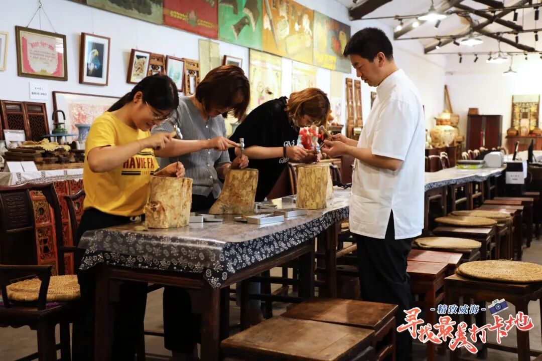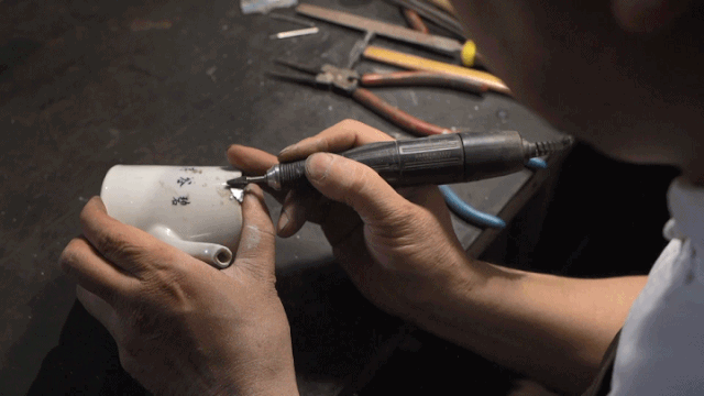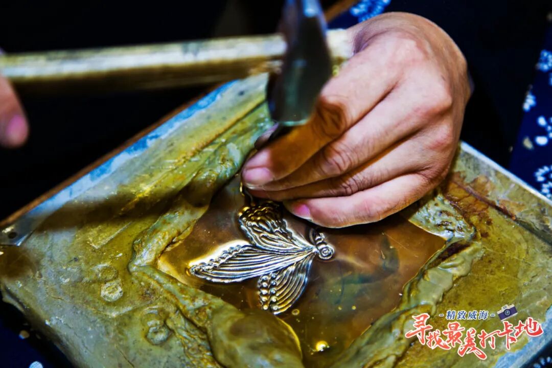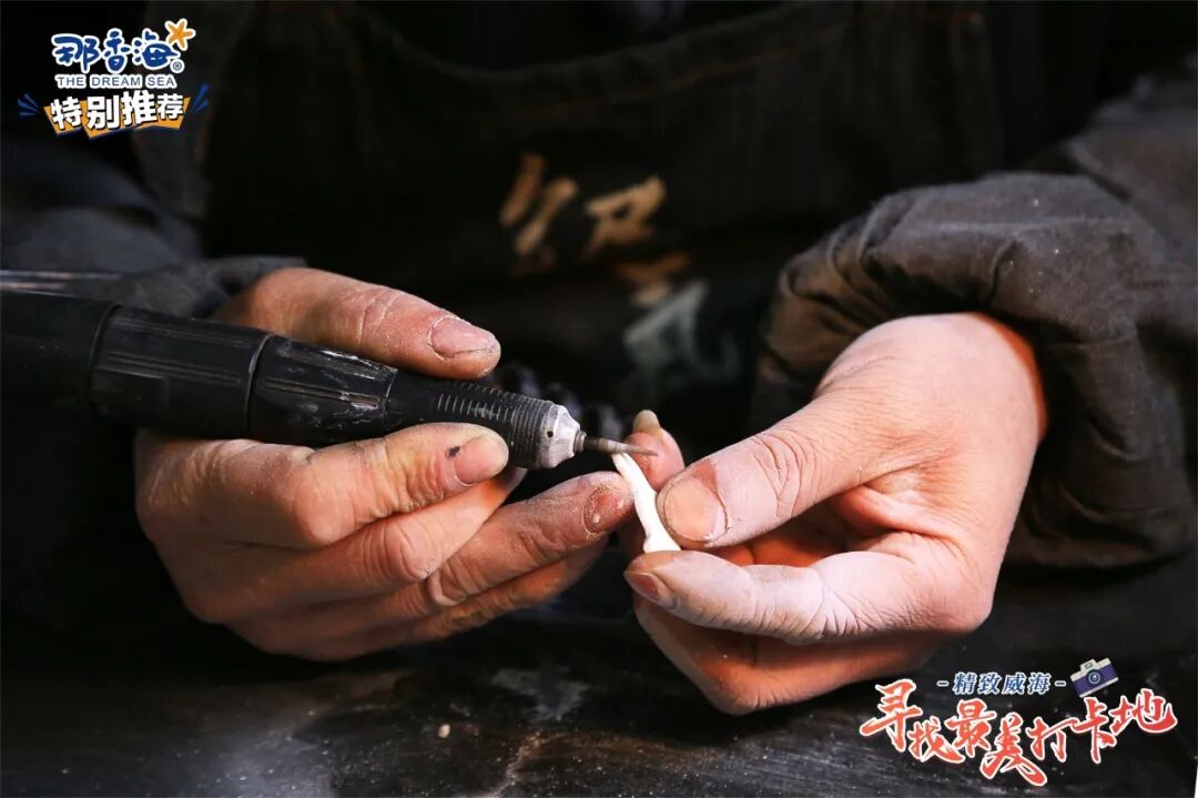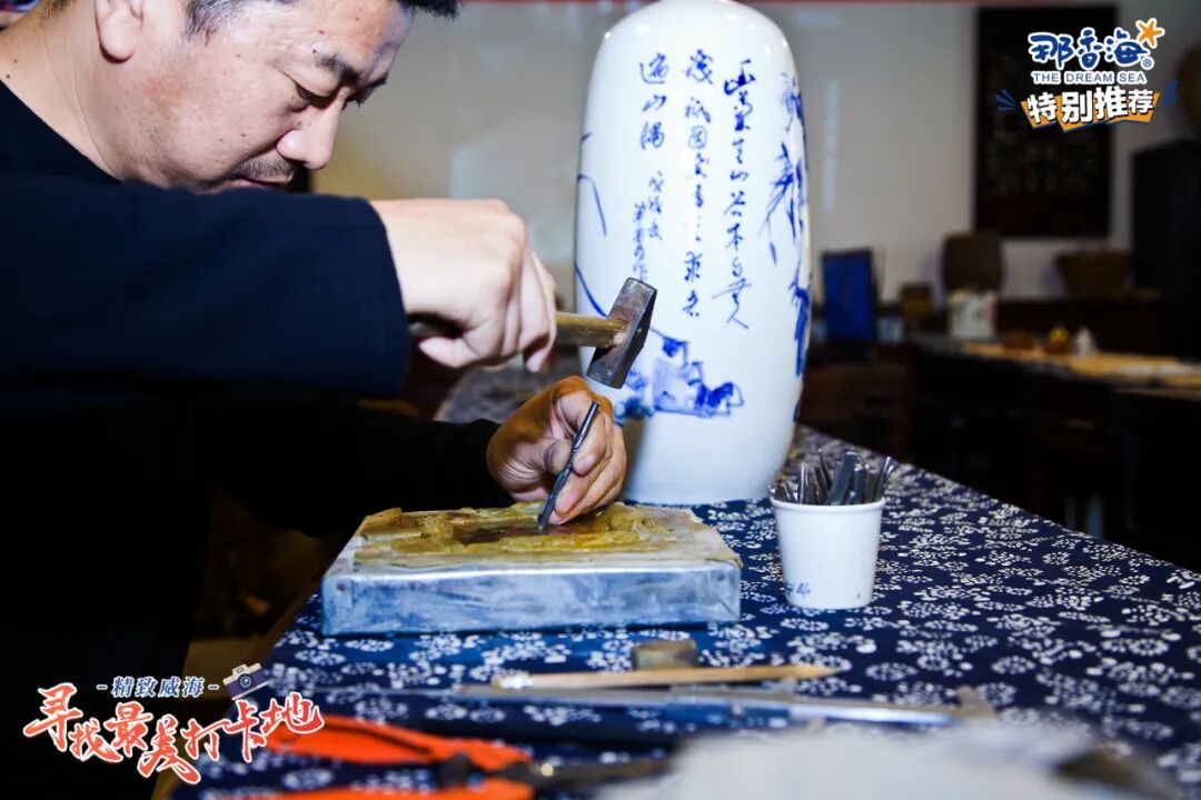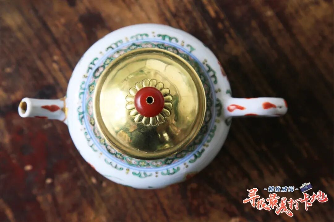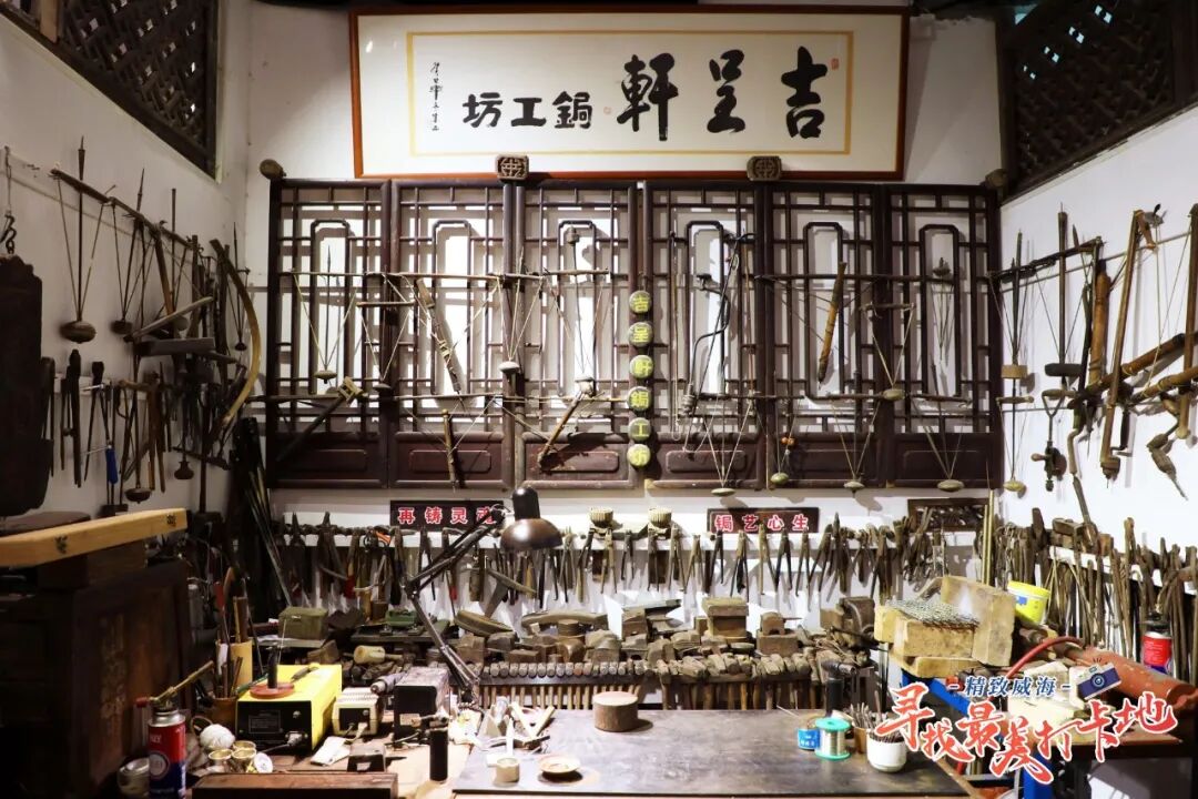 新威附路,威海最有韵味的一条老街,纵使时光流逝,但芳华依旧。在这条老街最北端的陶瓷厂院内,藏着一间锔瓷匠人的工坊,闹中取静,敞开门是繁华的街区,关上门可以进来享受一段悠闲的时光。走进吉呈轩锔工坊,随处可以看到充满威海味儿的老物件,还有古朴的木质桌椅、精美的锔瓷陈列品、挂满墙的锔补工具……都让人仿佛回到那个巷子里充斥着“锔盆,锔碗,锔大缸”吆喝声的年代。吉呈轩的主人名叫耿海胜,他是山东省非物质文化遗产传统锔艺项目的代表性传承人。此时的耿海胜正在修补一只破损的瓷盘,瓷盘裂成了两半,耿海胜仔细观察碎片的碴口后,小心地将破裂的碎片摆正,拼接起来,用绳子反复扎紧。中国有句古话叫“没有金刚钻,别揽瓷器活”,说的就是锔瓷这门手艺,锔补修复瓷器,最大的“利器”,就是独一无二的“金刚钻”和“锔钉”。耿海胜来回拉动钻杆,带动钻头旋转,动作娴熟,对力道的把握胸有成竹。选好锔钉,揳进钻孔,朝锔钉敲上一锤,一排敲下去,锔钉已经跟碗“咬”在一起,难分彼此。锔瓷全过程包括找碴、捧瓷、打孔、制钉、上钉和弥缝。看起来不难,但每个步骤都是细心活。对上碎片,细绳绑定,上弓打眼,截铜造锔,扬锤敲锔……每一步操作都考验着锔匠手头功夫的准确性和熟练度。播放“锔得漂亮才叫出活,其实最能体现锔匠水平的是设计各种造型的锔钉,让它与原有器物完美融合,兼具艺术性和实用性。”耿海胜说,正如这个釉色漂亮的名家书法瓷瓶,瓶口有残缺,耿海胜按照瓷瓶上的兰花图案和诗句的意境,设计了一个蝴蝶造型的锔钉,锔好后的金色蝴蝶好似停在瓷器上小憩,整个构图充满立体感,蝴蝶亦有展翅欲飞的动感。虽然修复的痕迹很明显,但却让器物仿佛拥有了新的生命。对原有器物的再创造,不仅能体现器物本身材质的美感以及锔活的美感,还能散发出二者交互产生的奇妙韵味,这才是锔瓷的魅力所在!在吉呈轩,除了可以看到破损的器物在耿海胜手中“涅槃重生”,你也可以亲自“上阵”,做一回锔匠。一个看似简单精巧的铜勺,做起来也并不简单,需要反复用锤敲出造型、錾刻图案、打磨抛光……东西虽小,却也是匠心演绎!播放“锔瓷不仅能修复破碎的器物,变换成另一类独具观赏和艺术价值的瓷文化工艺美术品,还能将其身上承载的情感更长久的传承下去。”这是耿海胜对锔瓷的理解。也正是因为有很多像耿海胜一样的锔瓷匠人的坚守,才让锔瓷这门流传了千年的老手艺得以传承。锔瓷代表的不仅是一种手艺,还是中华民族传统美德——勤俭节约的传承,更是中华文化的延续。惜物之心,跃然于器。锔瓷匠人用一颗“惜瓷惜福”的心传承一份文化,讲述一个故事,见证一段历史。作为非遗传承人,耿海胜觉得“传承”并不仅仅是工艺上的传承,还要与时俱进,所以他不断学习新的工艺,金缮、乌铜走银、錾刻、镶嵌、贴花,再加上符合现代审美的文创元素,锔瓷技艺在他手中变得更为灵活和美妙。“巧从心头起,妙在手中生。”是耿海胜对锔瓷这门手艺的精妙总结。指尖上的“破镜重圆”,离不开锔瓷守艺人的妙心细活,守护“残缺的美”,他们的心始终如一。锔瓷,其表为修复之艺术,其内乃圆容之人生。来吉呈轩,一起感受“涅槃重生”之美吧!