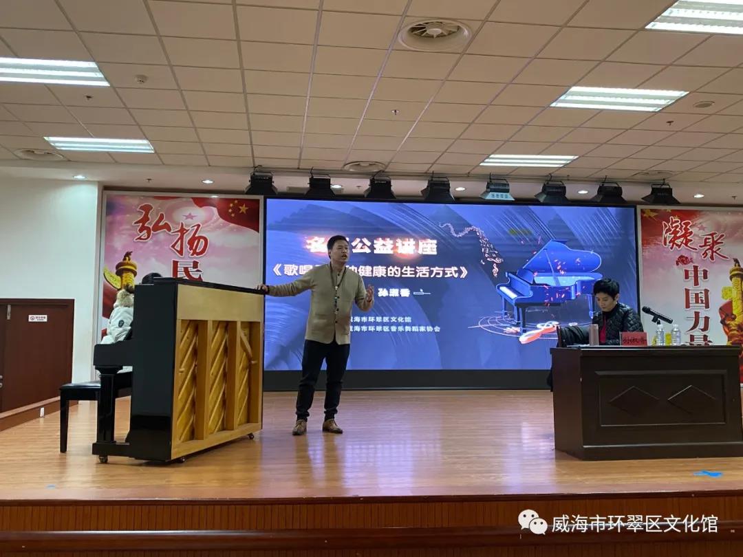 12月30日上午9点,由威海市环翠区文化馆主办,威海市环翠区音乐舞蹈家协会承办的名师公益讲座《歌唱是一种健康的生活方式》在威海文化艺术中心一楼多功能厅隆重举行,孙淑香老师作了精彩的讲座。参加讲座的除了各合唱团员还有声乐爱好者们,本次讲座旨在引导声乐爱好者走好进阶之路,对声乐爱好者的歌唱技巧及舞台表演作出了指导。